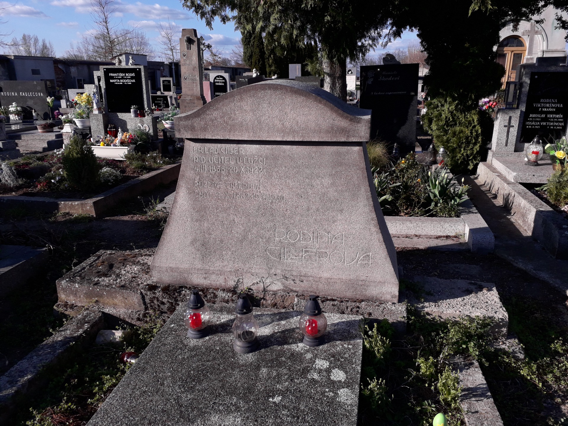 Architektonicky unikátní náhrobek ředitele školy Františka Cillera na hřbitově v Lužci nad Vltavou.